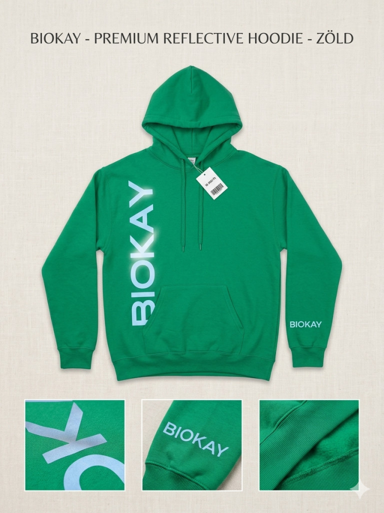 Fiatalos Logó: Az egyedi, függőleges BIOKAY logó a mellkason fényvisszaverő anyagból készült, amely éjszaka és gyenge fényviszonyok között világít, így növelve a láthatóságot és a biztonságot.